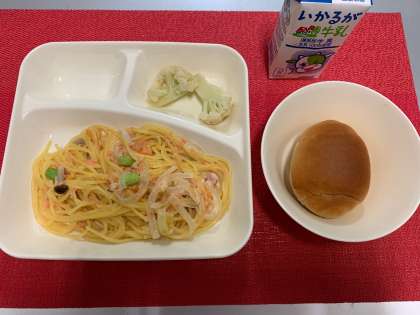 今日の献立は、『さけのクリームスパゲッティ・カリフラワーのサラダ・1/2黒糖パン・牛乳』でした。