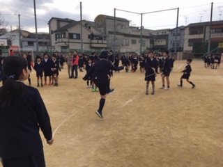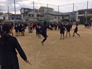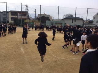 運動場で大縄で 仲よく遊びました。