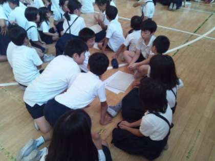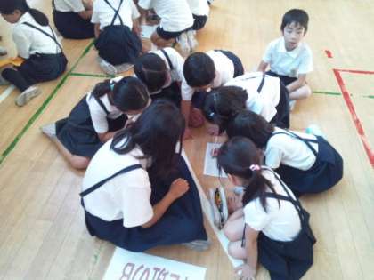 今日の児童集会はクイズです。縦割り班で力を合わせ問題を解いていました。問題は、集会委員会が考えてくれています。アニメやプロ野球など身近な話題からクイズが作られています。