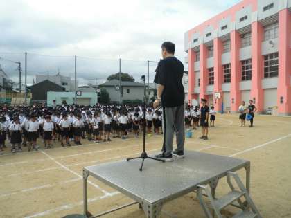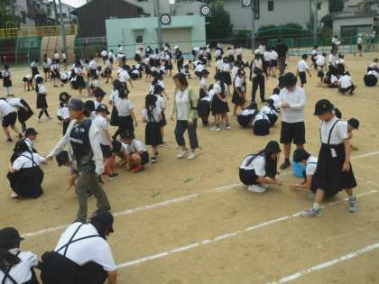 本日の全校朝会において、グランドの石拾いを全学年で行いました。運動会に向けた練習が、ますます本格的になるこの時期に、グランドコンディションの向上やけがの予防を兼ねて取り組みます。自分のためだけでなく、みんなのために努めることは、とても大切なことです。