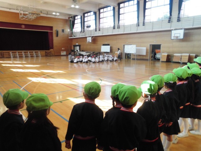 新年度に入学予定のある近隣の幼稚園・保育所から、学校見学に来てくれています。ちょうど1年生が体育の授業に取り組んでいた様子を、運動場と体育館で見てもらいました。見られている1年生も意識している様子で、4月には小学校の先輩として迎え入れる気持ちが高まっているようでした。