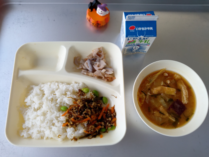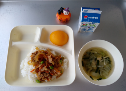今日の献立は「ピリ辛丼、中華スープ、黄桃(缶)、牛乳」でした。