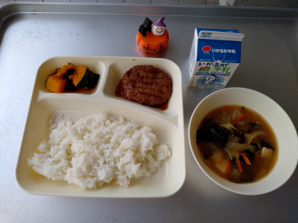 今日の献立は「和風ハンバーグ、みそ汁、かぼちゃのいとこ煮、ごはん、牛乳」でした。