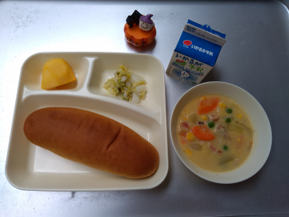 今日の献立は「豆乳コーンクリームシチュー(米粉)、はくさいのピクルス、かき(平核...