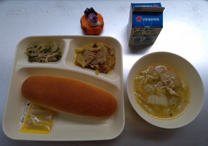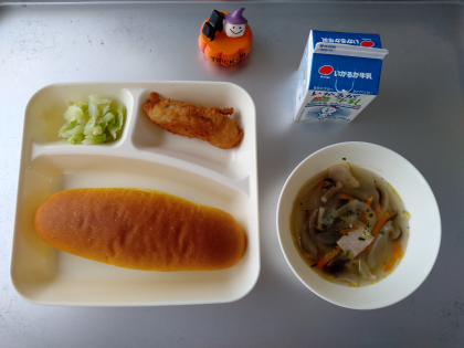 今日の献立は「たらフライ、スープ、あっさりキャベツ、パンプキンパン、牛乳」でした...