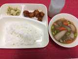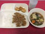 今日の献立は、鶏肉とじゃがいもの煮もの・あつあげのしょうゆだれかけ・紅ざけそぼ...