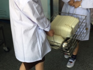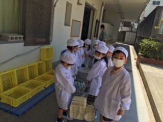 給食当番が、給食室にパン屋おかず、食器などを取りに行きます。入り口で給食調理員さんに大きな声で「いただきます!」と言ってから中に入って受け取ります。みんながそろうのを待って、教室まで運びます。