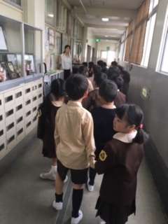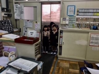 学校の中のいろいろな教室を見て回りました。職員室では、用事がある時の入室の仕方を学習しました。学年・組、名前、用事を言ってから入る練習を一人ずつしました。緊張した様子でしたが、友達の様子を見て上手にできました。まだまだ学校めぐり、探検は続きます。