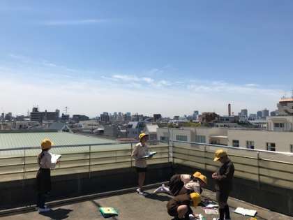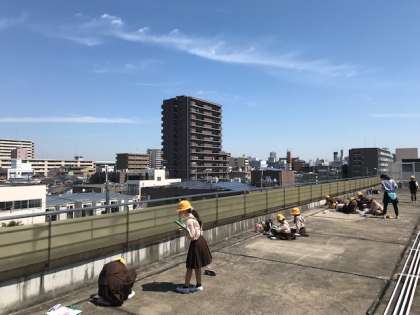 3年生が社会科の時間に屋上に行き、「学校のまわりのようす」を調べました。東西南北の方角を眺め、学校のまわりにある高いビルや山、大学やスーパーなどをたくさん見つけ、ワークシートに記入しました。