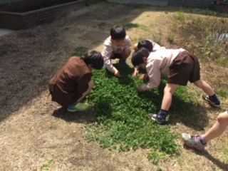 暖かくなって、いろいろな生き物が活動をはじめました。ビオトープの池の黒メダカもたくさんの卵が孵り、元気に泳いでいます。「四つ葉のクローバーがあったよ!」とうれしそうに報告してくれました!自然の生き物と触れ合う機会をできるだけ子ども達に体験させたいです。