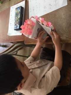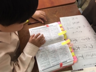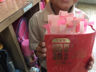 国語辞典をもらった2年生は、たくさんの言葉を調べています。付箋がどんどん増えてきました!同じ言葉でも意味が違うものや、いくつかの意味が書いてあって、どれがふさわしい意味なのか、よく考えています。