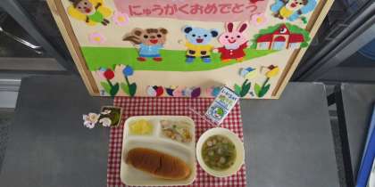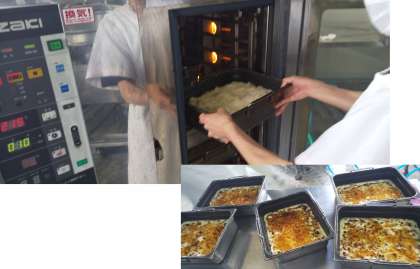 給食では、ルウから手作りの具だくさんのグラタンが登場します。大きな焼き物機でこんがり焼きあげました。
