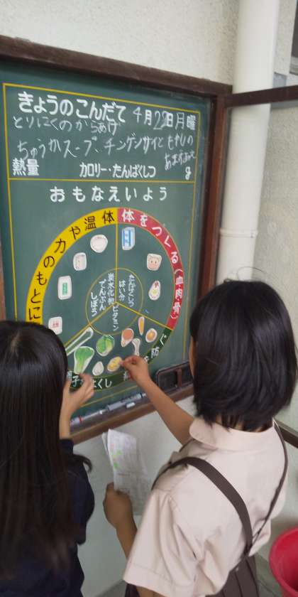 給食室前では、次の日の給食に登場する食べ物を栄養黒板に貼って掲示する仕事を給食委員会が行っています。とても手際よく、黄赤緑の働きの仲間ごとに食品カードを貼ってくれていましたよ。