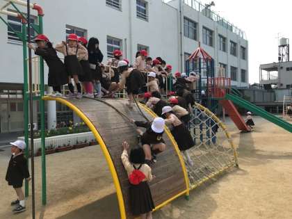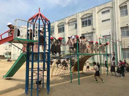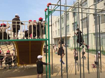 運動場にある遊具が大人気です。休み時間になると子どもたちがたくさん集まり、遊具を使って楽しそうに体を動かしています。