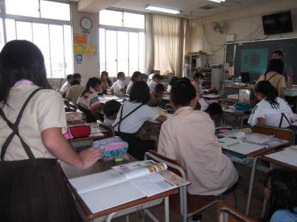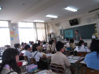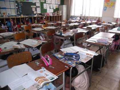 さすがは6年生。授業の最中でも、素早く行動に移します。腕でしっかりと頭をガード。災害から身を守る行動ができています。