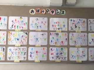 パスの使い方の第一歩。小さくぐるぐる塗ったり、線を太くしたり細くしたりして選評を楽しみました。ほんとうにおばけのダンスのようですね!