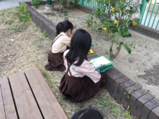 春の自然を観察しに来た2年生と4年生が、ビオトープで一緒になりました。同じものを見ていても、気づきやなぜ?といった感じ方は違うのでしょう。