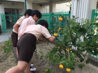 たまたま今日の給食には甘夏みかんが出ていましたよ!こんな風に木になっているんですよ。