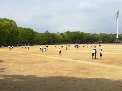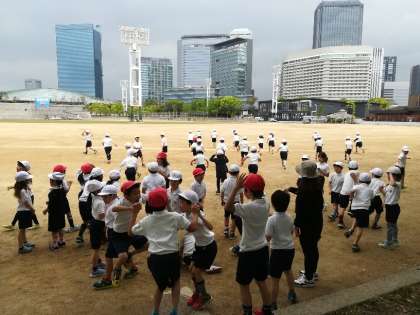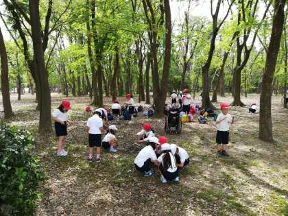 広場に行って、遊びます。鬼ごっこをしたり、林の中で木を集めたり、虫を探したりして遊びました。