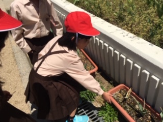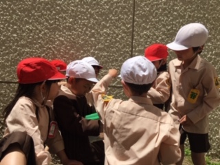 休み時間、1年生がダンゴムシを探してプラケースに集めています。植木鉢やプランターを動かしていうしよう懸命探しています。知らない虫も出てきて、びっくり!!何という虫か、調べてね!