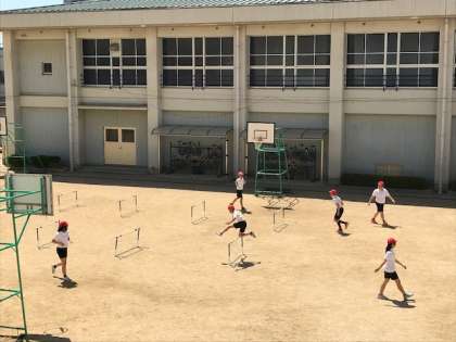 運動場で、ハードル走をして体を動かしました。ハードルをより速く飛び越え、ゴールをめざしてダッシュしました。