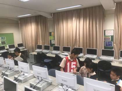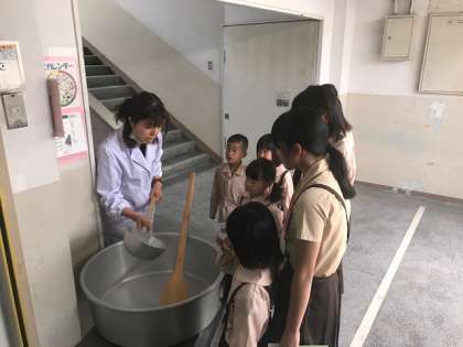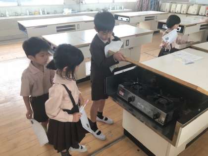 1年生が6年生と一緒に学校を探検しました。特別教室で、コンロやパソコン、給食室で使う大きな道具を見て、興味が湧き、いろんな質問をしていました。これからの6年間がとても楽しみですね。