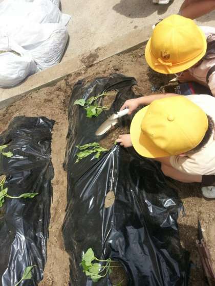 学習園にサツマイモの苗を植えました。秋に獲れたサツマイモを使ってスイーツを作り、サツマイモパーティをする予定です。楽しみですね。
