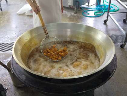 ワインなどで下味をつけた豚肉に小麦粉で作った衣とパン粉を丁寧にまぶして大きな釜でカリカリに揚げた手作りのトンカツに、にんにくの香りのきいた具だくさんのミネストローネを組み合わせました。暑い日にも食欲がすすむ子どもたちに人気の献立です。