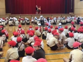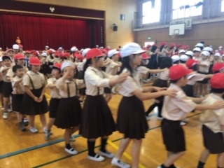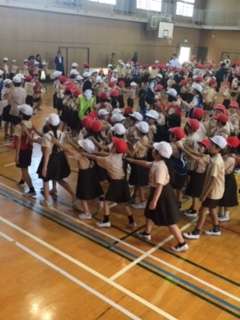 「じゃんけん列車」をしました。じゃんけんをして、負けた人が、勝った人の後ろにつながっていきます。たてわり班以外の人とも仲良くなります。