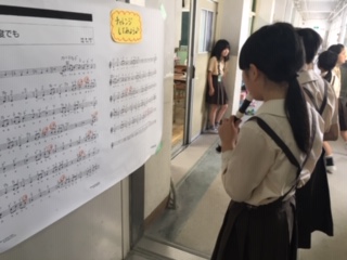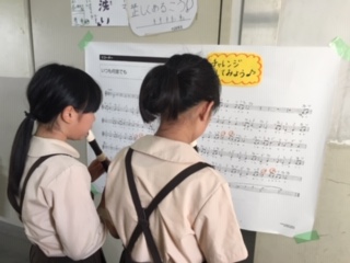 廊下に掲示した「いつも何度でも」の楽譜を見ながら一生懸命練習していました。3年生が尊敬の眼差しで見ています。よき伝統となっているのですね。