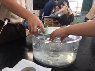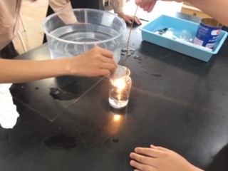 酸素を集気瓶に集め、火のついたろうそくを入れるとどうなるか、確かめました激しく、勢いよく燃えることを観察しました。