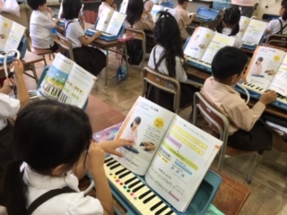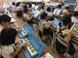 鍵盤ハーモニカを練習しました。歌に合わせて「ド」や「ソ」の音を弾いたり、好きな音を出したりして指使いを練習しました。