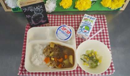 子どもたちに人気のカレーには、牛肉の他に「畑の肉」も加えて調理しました。和風の煮ものによく使われる栄養たっぷりの大豆は、カレーなどの洋風の煮ものにも合いますよ。ラッキー人参、今日は星や花の形が入っていました。