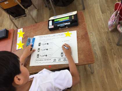 「給食の食べ物をバランスよく食べるためにはどうしたらよい?」の問いには、「全部食べる」や、「好きなものと一緒に食べる」、「苦手なものを先に食べる」など一生懸命考えて発表していましたよ。