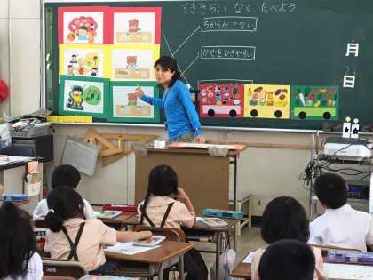 「すききらいなく たべよう」のテーマで、1年1組と2組で、食育の授業を行いました。始めに栄養教諭が入学してから食べた給食で好きだったものを聞くと、どちらのクラスも「カレーライス」が多く、また、魚は硬くて苦手、野菜は苦いから嫌いなども素直に教えてくれて、みんなと同じようにすききらいのある3匹のこぐまの紙芝居を聞いて、バランス良く食べることの大切さを学びました。
