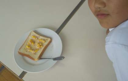 27日は、自分で簡単に作れる朝ごはんとして、具をのせたトースト「朝からデラックスなマツコパン」を焼きました。名前の由来や、のせた具については、6月の児童集会で発表します。