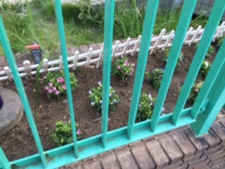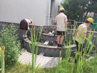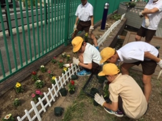 6時間目、飼育栽培委員会児童が、ビオトープの花壇に、ジニアやポーチュラカなどの、夏の花を植えました。きれいになりました。