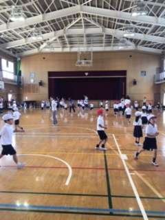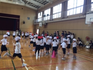 体育館で合同体育をしました。体ほぐしとミニリレーです。お家の人に見てもらい、いつもより張り切って走ったり体を動かしたりしました。