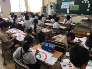 図工をしました。2年になって絵の具を使い始めます。今日は2回目。色を混ぜて新しい色を作る学習をしました。