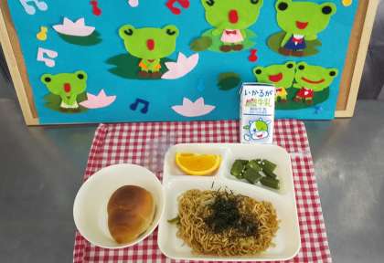 今日の献立は、焼きそば、オクラのかつお梅風味、オレンジ、ミニ黒糖パン、牛乳でした。
