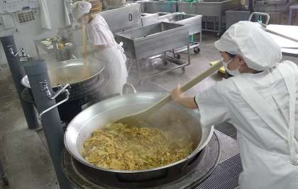 給食の焼きそばは具だくさんです。豚肉、いかの他にキャベツ、玉ねぎ、ピーマン、にんじん等たくさんの野菜も入ります。