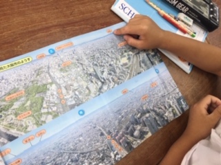 大阪市の町全体を航空写真で見て、気がついたことなどを発表しました。今度あべのハルカスに行って、実際に自分の目で確かめます。