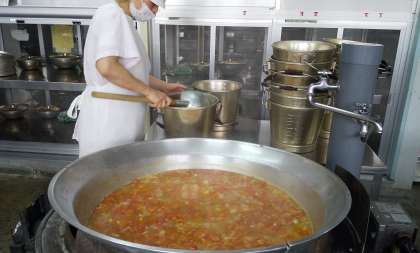 「トマトが赤くなると、医者が青くなる」ということわざがあるほど、赤く熟したトマトには、皮膚やのど、鼻の粘膜などを丈夫にするカロテンやビタミンCがたっぷり含まれています。旬の生のトマトはスープにしてもおいしいですよ。給食では、鶏肉、じゃがいも、玉ねぎ、人参、むき枝豆と一緒に彩りよく仕上げました。