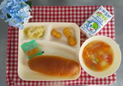 今日の献立は、いかてんぷら、フレッシュトマトのスープ煮、サワーソテー、コッペパン、りんごジャム、牛乳でした。