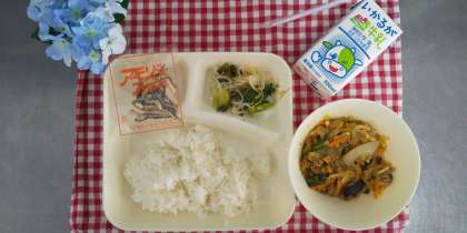 今日の献立は、マーボー春雨、チンゲンサイともやしの甘酢あえ、アーモンドフィッシュ、ごはん、牛乳でした。