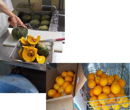 給食室には、たくさんのかぼちゃやオレンジがならびました。ミートグラタンは、ルウを小麦粉から作る手作りで、今が旬のかぼちゃを主材に作りました。とても人気がある献立で、みんなしっかり食べていましたよ。