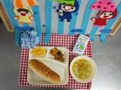 今日の献立は、かぼちゃのミートグラタン、スープ、オレンジ、おさつパン、牛乳でした。