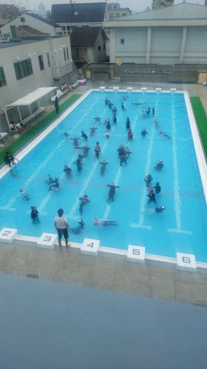 プールで着衣泳の学習を行いました。服を着たまま水の中で動く時の重さ、体の浮かせ方など、いざという時のために実際に体験をして学びました。
