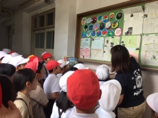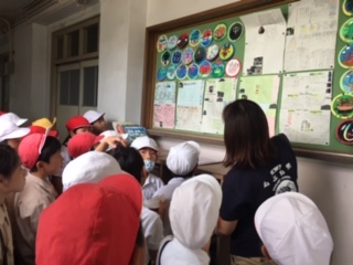 廊下に掲示してある6年生の歴史新聞を見ていました。見出しの工夫、写真の選び方などを参考にしながら、新聞作りを行なっていきます。
