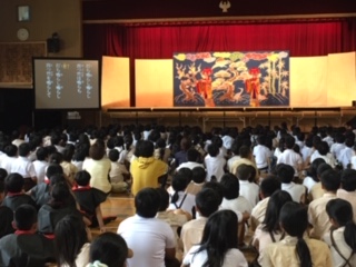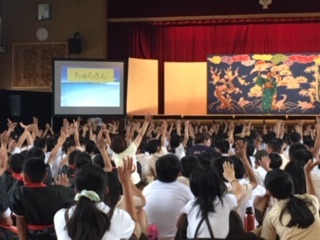 5日5時間目、沖縄伝統「子の会」、「重踊流」の皆さんによる組踊を体験しました。先日ワークショップで体験したことを思い出し、沖縄言葉の復習や歌を歌いました。